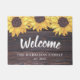 A rustic welcome doormat for your home that features a faux dark wood background, cheerful sunflower watercolors and your family name and year established.