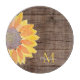 This rustic cutting board is decorated with a yellow watercolor sunflower on a barn wood background.