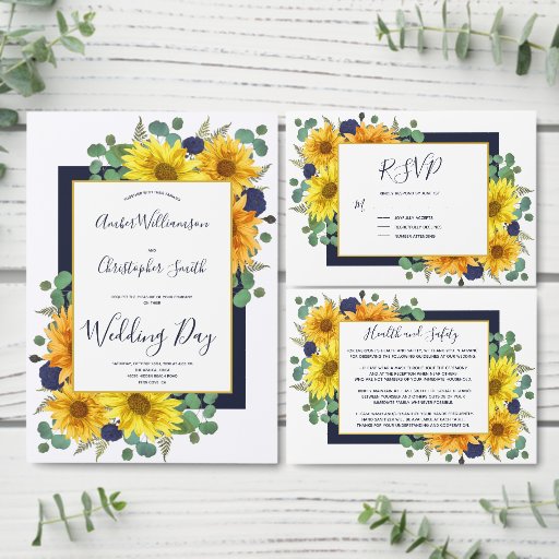 This beautiful, modern, rustic design features lush bouquets of sunflowers, navy blue roses, and greenery including eucalyptus leaves and ferns. Behind the bouquets is a dark navy blue rectangle, and in front is a gold-edged white area with the customisable text in navy blue in trendy, elegant script and sans serif typography. The back is matching navy. You can personalise this item for your special event by changing the text in the product template.