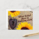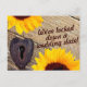 This design features a photo of sunflower with a rustic wood grain background. A heart shaped lock is set into the wood. The humourous text reads "We've locked down a wedding date". Personalise this postcard with information of your wedding. This postcard works well for sunflower theme, summer, western, barn, outdoor, country, backyard or fall / autumn weddings.