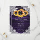 Purple and sunflower wedding save the date cards featuring sunflowers and white floral lace against a rustic wood background. Matching items available.