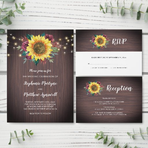 These reply cards feature watercolor sunflowers with burgundy roses and foliage with wood design. Personalise them with your own text. Matching items are available. Please visit our store to see the full wedding suite.