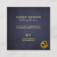 Rustic modern style square business card featuring a big sunflowers bouquet, strings of white twinkle lights and gold trendy typeface typography script on a classy dark midnight navy blue chalkboard background. ++++++++++++ Suitable for rustic wedding or other events planners, gardeners, landscape designers, florists, photographers.