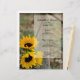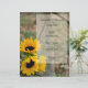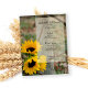 Customize the informal yet elegant Rustic Sunflowers and Wagon Wheel Country Wedding Menu with the details of the meal that you will serve at your western ranch theme bridal shower, marriage reception dinner or post wedding brunch. Personalize it with the names of the bride and groom, venue location and date. This charming custom flowery nuptial menu features a quaint digitally painted floral photograph of yellow sunflower blossoms and a rusty old wagon wheel. Perfect inspo for a casual farm style barn party celebration event.