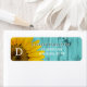 Create your own monogrammed, rustic wood sunflower teal wedding return address labels- Background of teal, weathered, rustic wood planks. On the left is a monogram initial centred on a country yellow sunflower in the corner. To the right are couple's personalised names and address. Note: All images are printed. Not actual wood. Ready to customise however you like- add date, any custom text you prefer. Rustic country teal monogram initial return address labels for outdoor nature lovers and gardeners, but also perfect bride and groom wedding labels for rustic wedding turquoise colour themes, popular bohemian woodland forest weddings, western themed weddings, barn weddings, outdoor fall weddings, and country wedding labels.