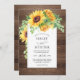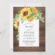 With rustic charm, this distinctive wedding invitation design has cascading sunflowers along the top and side edges. A rich wooden texture in the background adds to the simple appeal. The text layout and wording used in this design has a casual friendliness using the first names of the bride and groom. Personalise this text with your details. This design is a wonderful choice for weddings held in barns, outdoor venues, wineries or other rustic or rural venues.