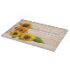 All the tough beauty of sunflowers bunched on a corner of a rustic wooden background. The design contains muted ochres, bright vibrant yellows, pink and green
