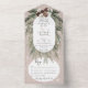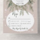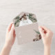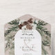 ALSO AVAILABLE WITH A QR CODE TO SCAN. This design features a rustic green pine and pinecone bouquet on a soft tan beige background with white flowers. It is accented with a white sparkle overlay to illustrate the magic of the beautiful winter holidays. Perfect for a Christmas or winter wedding. Personalised All-In-One invitations are a unique combination of both a beautifully printed custom invitation with an easy to tear off perforated RSVP postcard. And they are so easy to use! You simply fold, then seal the back flap with the three included clear stickers, and mail. And when your guests receive your custom invite, they just tear the perforated RSVP Card off and drop it back in the mail to you!