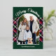 This elegant holiday card features a rich dark green background accented with a classic tartan plaid in festive red, green, black, and white. Customise with your favourite family photo, which will be displayed in the rustic arch shaped 'frame', with your name(s) below the picture. The greeting "Merry Christmas" curves elegantly above the arch in stylish script typography. Your choice of gold, silver or rose gold foil creates a festive shine on the text, giving a touch of luxe. To continue, click 'Personalise' to upload your photo to the template and enter your name(s) or other message. Full of seasonal charm, this card is ideal for sending Christmas wishes to family and friends.