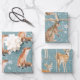A rustic teal blue color holiday wrapping paper sheet set featuring watercolour-painted winter animals: a doe reindeer, a hare rabbit and a red fox experiencing their first snowfall in a repeat pattern on a warm vintage muted teal blue color background.