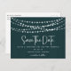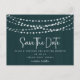 Rustic Teal Wood String Lights Save the Date - The perfect Save the Date for the bride and groom who love a rustic theme. Rustic wood with glowing string lights handwritten style script typography and hanging greenery. The back of the template allows for your return address, and QR code to your wedding website.