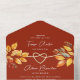 Celebrate your love with this earthy and romantic fall wedding invitation, designed in warm terracotta tones and accented with burnt-orange watercolor autumn leaves. A delicate gold rope heart adds a symbol of everlasting connection, while elegant script font enhances the invitation’s refined rustic-boho style. Perfect for couples seeking a blend of nature-inspired charm and modern convenience, this all-in-one invitation features an easy-tear RSVP section and a QR code for your wedding website. Ideal for cosy barn weddings, outdoor ceremonies, or autumn celebrations with timeless warmth and personality.