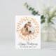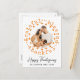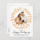 This rustic Thanksgiving card features a white background and a circular photo in a wreath made of words: thankful, blessed, grateful, and some cute Thanksgiving symbols like cook turkey and pumpkin pie. The frame has a light orange colour, which matches the back of the card. Under the photo, there are thanksgiving greetings, a family name, and a year. The text is in a black elegant script / rustic font. You can easily create your own card by clicking Personalise this template button and changing the details for your own. Have a Happy Thanksgiving!