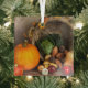 An ornament with a photograph of a thanksgiving harvest, set on a rustic wooden table. Pumpkin, potatoes, squash etc... make up this bountiful collection of food. Colourful autumn leaves surround the cornucopia basket.