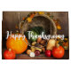 A gift bag with a photograph of a thanksgiving harvest, set on a rustic wooden table. Pumpkin, potatoes, squash etc... make up this bountiful collection of food. Colourful autumn leaves surround the cornucopia basket.