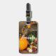 A luggage tag with a photograph of a thanksgiving harvest, set on a rustic wooden table. Pumpkin, potatoes, squash etc... make up this bountiful collection of food. Colourful autumn leaves surround the cornucopia basket.