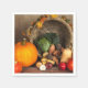 Paper napkins with a photograph of a thanksgiving harvest, set on a rustic wooden table. Pumpkin, potatoes, squash etc... make up this bountiful collection of food. Colourful autumn leaves surround the cornucopia basket.