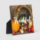 A photo plaque with a photograph of a thanksgiving harvest, set on a rustic wooden table. Pumpkin, potatoes, squash etc... make up this bountiful collection of food. Colourful autumn leaves surround the cornucopia basket.