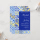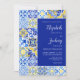 This rustic design features a background pattern of blue, white and yellow watercolor Portuguese tiles. Personalize it with the names of the bride and groom in navy blue calligraphy script and the remaining text in a combination of sans serif, copperplate and italics on a white rectangle aligned with the right edge of the card. A matching tile pattern appears on the reverse side.