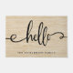 This doormat features a rustic, linen burlap look background and modern black typography that says "hello".