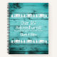 Personalised camper RV journal notebook- Cute rustic teal wood RV camping gift for RV retired couples, and rv campers. Reads 'Our RV Adventures' in handwritten look, white letters. Underneath is personalised names of couple or family. With a cute, white border at the top and bottom of rows of vintage motorhome camper RVs and pine trees. Against a turquoise teal background of rustic, distressed wood boards with knotholes. Fun retirement gift for mum and dad that like to take road trips. Note: All images are printed. Not actual wood. Will appeal to many different tastes and styles. Visit our online Zazzle.com/angela65 shop for matching RV theme decor and more office gifts and unique notebooks.