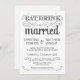 Eat, Drink, and be Married -- Vintage style rustic country wedding invitations -- Swirly, curly scrolls and old-fashion typography on plain white background. Add your names and wedding info in this easy to use template. Elegant but fun and whimsical, chalkboard style script writing can be modified for your formal or semi-formal retro wedding theme. Casual modern style is perfect for trendy contemporary weddings with a fun touch of sophisticated charm for the traditional bride and groom. Please contact us for help with customisation if you need additional room for your wedding details. Other sizes and chalkboard styles available.