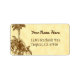 A custom address label with script and retro letters and a rustic etching of tropical palm trees in brown on a faux parchment background.