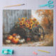 A rustic autumn still life painting featuring a wooden wagon filled with bright sunflowers.