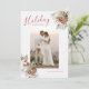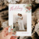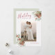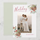 This on trend photo holiday Christmas card features rustic, hand painted winter greenery, including pinecones, evergreen and berries. A modern script font and a clean white background add a layer of sophistication. This photo card would be suitable for families with children or newlyweds.
