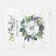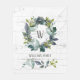Get cozy and warm with this personalized rustic fleece wreath blanket. The elegant design features a watercolor botanical wreath in shades of teal, sage green and green on a background of white and gray faux weathered wood. In the center is a monogrammed initial accented by a flourish and family name below for you to customize in charcoal gray typography. From our hearts to yours, enjoy!