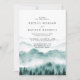 Elegant and rustic wedding invitation features watercolor mountain with trees and brides and grooms initials in the back.