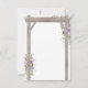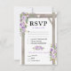 Elegant wedding response cards featuring a classy chic white background that can be changed to any colour, a stylish purple & lavender watercolor floral display on a rustic wooden wedding arch, a carved heart with the couples initials, and a simple wedding rsvp template with a menu option.