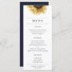 Rustic watercolor sunflower, modern wedding menu card. Template provides space for names, date and three menu title headings with descriptions. Backing colour shown in coordinating dark navy blue, can be customised.