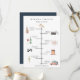 Rustic colourful watercolor wedding day elements, timeline program. Card features church, camera, bottle with glass, plate setting, music notes, cake, bouquet, and retro car. Backing colour shown in muted navy blue can be customised. Text font style and colour can also be customised.