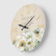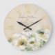 This vintages style romantic floral wall clock features a rustic parchment paper design background with watercolor ranunculus flowers. A delicate bouquet of ranunculus and greenery is pictured on the bottom. Sample names of a newlywed couple and wedding date are printed above. You can personalise the clock to include your own custom names or text. The hours are printed in a gold foil Roman numeral design.