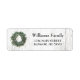 These rustic holiday address labels feature a festive laurel wreath on the left a top a white and grey weathered wood background. On the right is your name and address in black typography which may be personalised. Designed by artist © Susan Coffey.