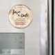 The magnets feature a printed wood grain cut disc, creating a charming and authentic look. The wood texture is carefully printed on the magnets, adding to their rustic appeal. Customise this editable template by adding your wedding date, location, and the full names of the bride and groom.