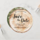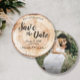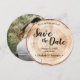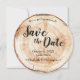 Rustic Wedding Save the Date Photo Wood Grain Invitation—a blend of natural charm and romantic elegance, perfectly tailored to your rustic wedding theme. This unique round card captures the essence of wood grain, emulating the rustic disc slices often seen at beautiful and romantic weddings. *Printed texture wood on paper