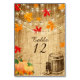 Rustic wedding table card for a country western wedding with string lights, fall leaves, pumpkins, cowboy boots and a barrel on a wood background.