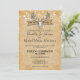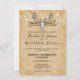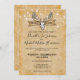 Elegant and Rustic, "The Hunt is Over" Wedding invitation. Deer trophy skull silhouette at the top with words "The Hunt Is Over" in his horns. Background is vintage faux paper. Large antler deer skul hand drawn by ©Tina Hesskew of Fishing Hunting Life.
