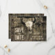 Rustic western wedding bull cow skull with horns vintage style save the date announcement flat card. Ranch grunge texture. Barn wood cowboy inspired. Antique sepia brown bison fine art. Image copyright Marg Seregelyi Photography.