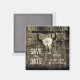 Rustic western wedding bull cow skull with horns vintage style save the date announcement square fridge magnet. Ranch grunge texture. Barn wood cowboy inspired. Antique sepia brown bison fine art. Image copyright Marg Seregelyi Photography.