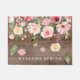 Beautiful watercolor pink & yellow floral doormat set on a rustic faux wood background.
