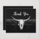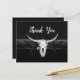 This folded budget thank you card features a rustic western black and white bull cow skull country rodeo cowboy wedding theme. Farmhouse style, old wild west vintage antique, cool, trendy, modern farm animal customised design. Image copyright Marg Seregelyi Photography.