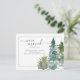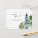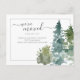 This design features watercolor pine trees and custom script calligraphy on a simple background.