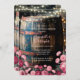 This charming rustic whiskey barrel serves as a unique wedding décor piece, featuring a weathered, aged appearance that exudes vintage elegance. Resting on a wooden platform, the barrel is topped with a sturdy lid, perfect for use as a decorative accent or functional display. A warm string of lights wrapped around a wooden post softly illuminates the dark background, creating an inviting ambiance. Delicate pink and burgundy florals frame the bottom of the scene, adding a romantic and sophisticated touch, making it an ideal setting for a rustic, barn, or country-style wedding.