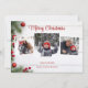 Cheery customisable Merry Christmas greeting and text fields with three-photo template on rustic white barn wood siding, pine and red ornaments.