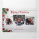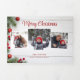 Cheery customisable Merry Christmas greeting and text fields with three-photo template on rustic white barn wood siding, pine and red ornaments.