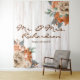 Rustic White Barn Wood Planks background, with gorgeous bouquet of flowers in burnt orange and cream florals with dusty green botanicals on the top right and lower left corners elegant script typography for personalised Mr. and Mrs. family name; combined with serif typography for customisable since date. It is a timeless design made specifically for a rustic wedding, or anniversary celebration.