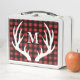 Rustic metal lunch box with white deer antlers, white initial letter, and a buffalo check plaid background.
